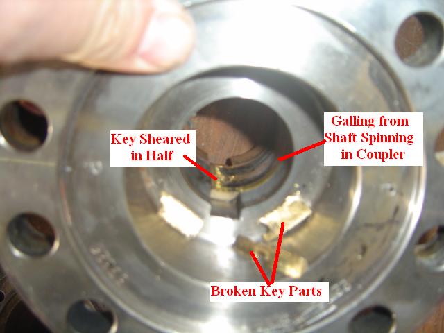 During dis-assembly the couplers were unusually hard to remove. Once removed the damage was apparent. Both coupler keys had been damaged. The coupler on the problematic side was completely sheared and there are clear signs of galling due to the shaft spinning inside the coupler. This is a catastrophic level of damage.