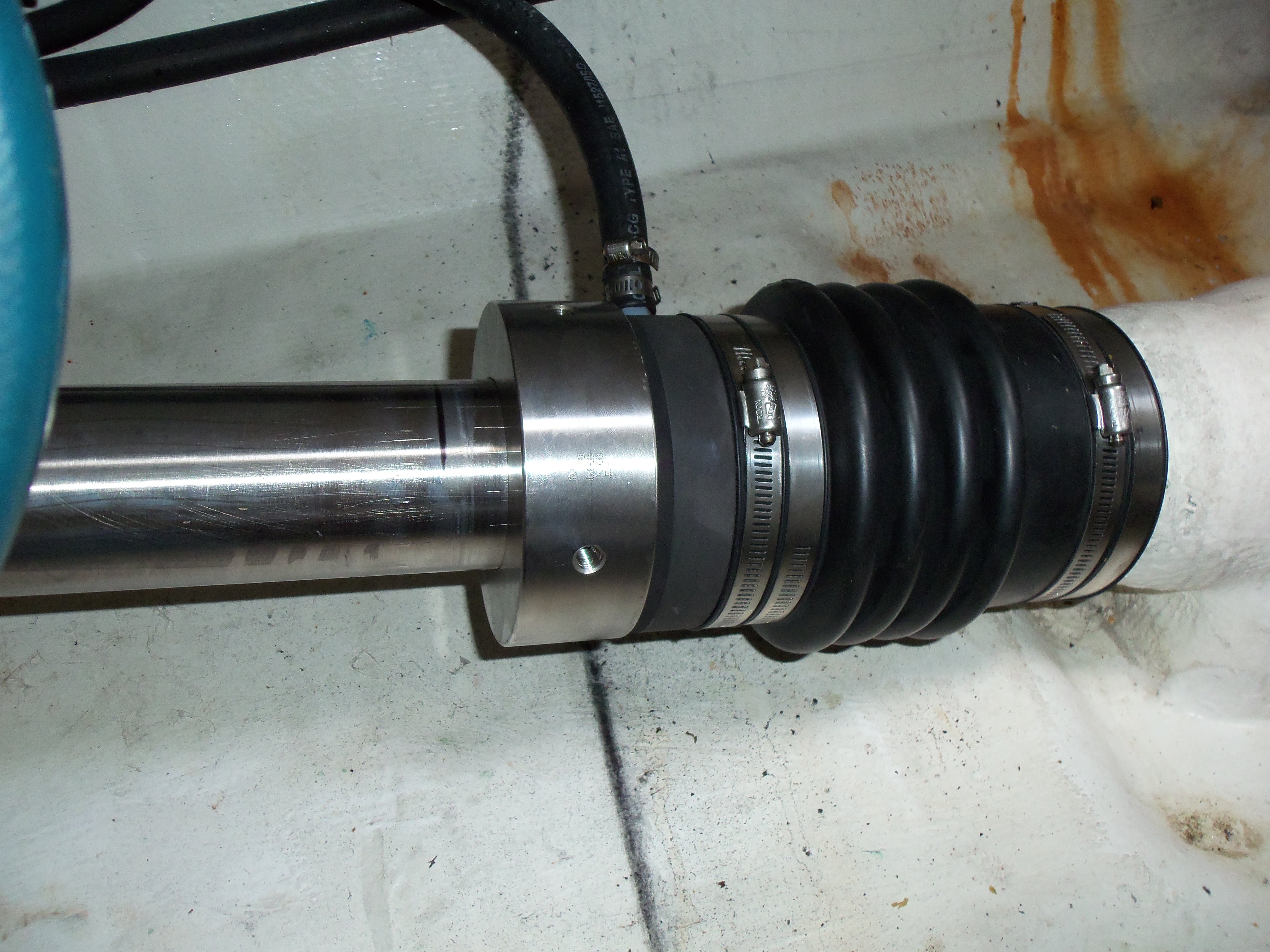 Finally, during installation the stainless steel ring is compressed a distance, per the PSS manual (it varies with shaft diameter). Notice in the picture the sharpie mark on the shaft showing the position of the ring in the neutral state prior to compressing the bellows.