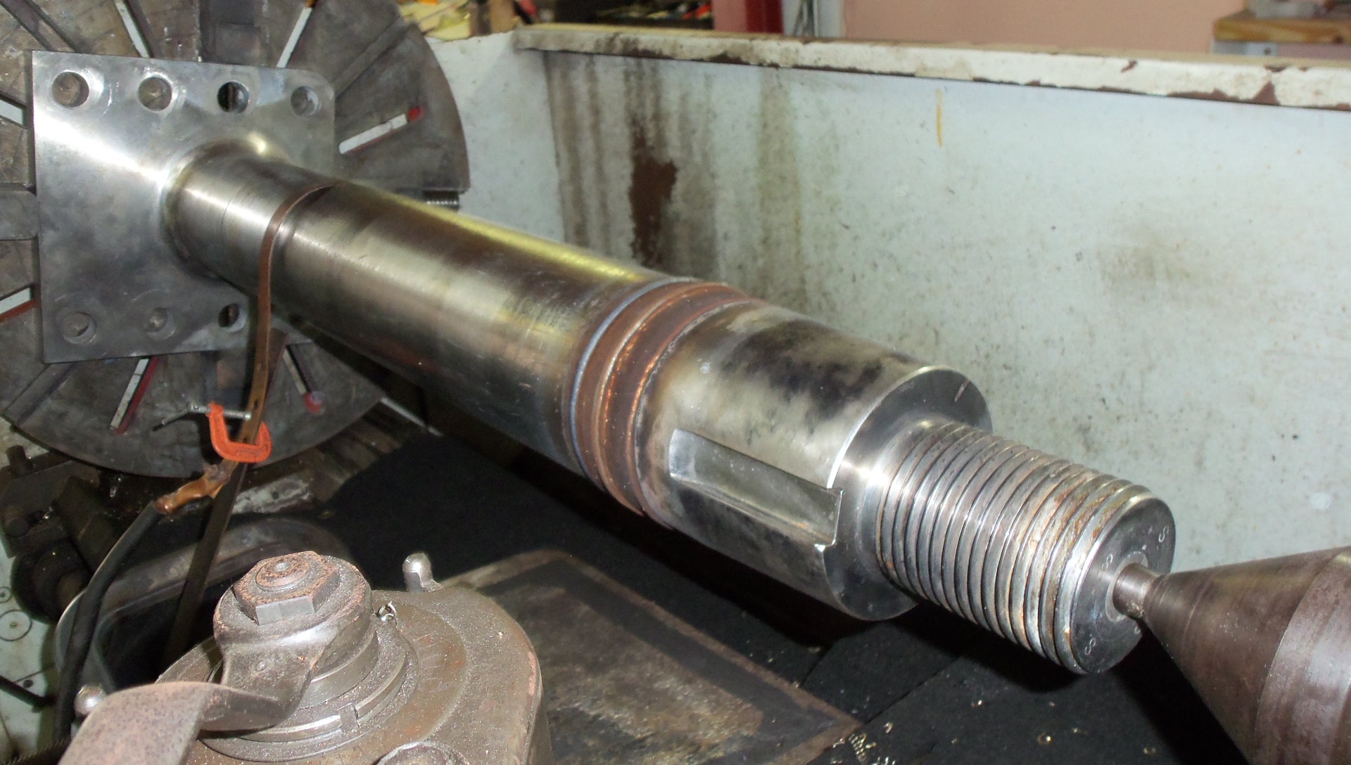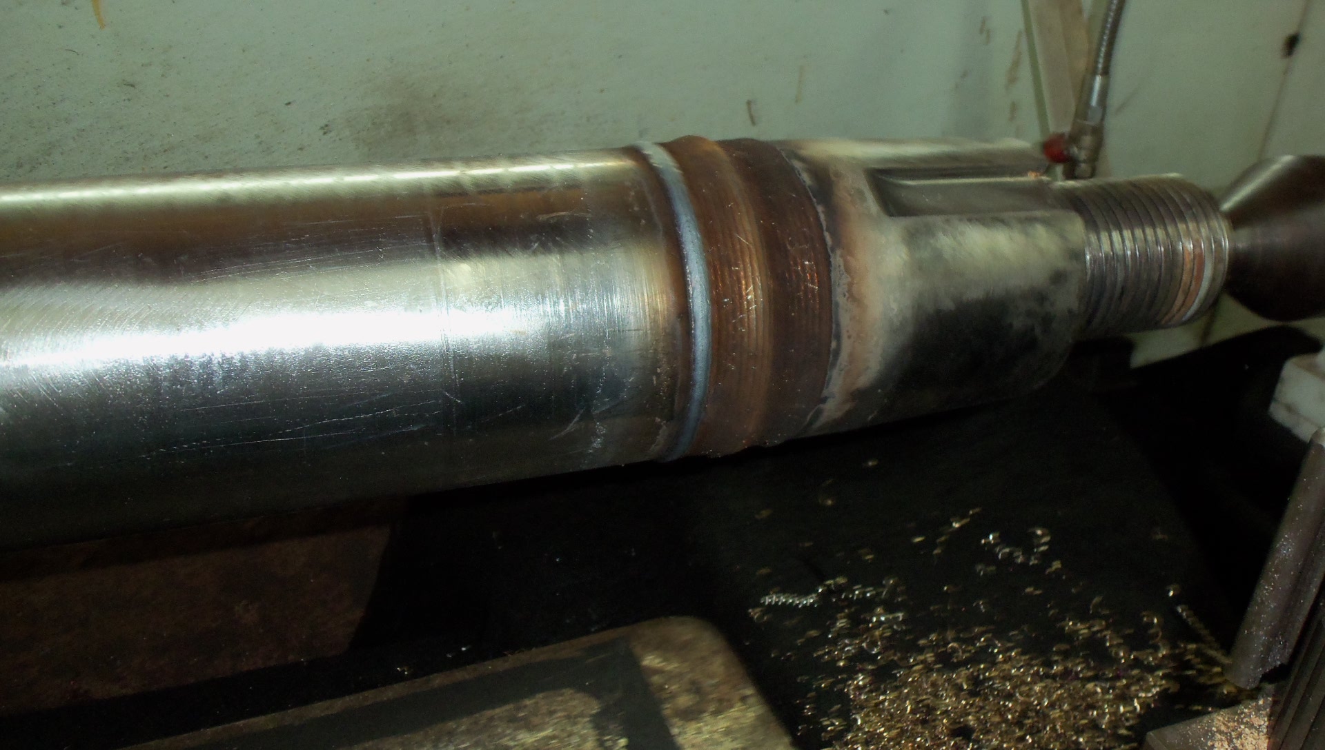 While many captains and engineers are familiar with propulsion shaft cladding Propulsion Shaft Cladding, few know that cladding techniques are also applicable on rudder stock. The stock, less the flag is lathe turned to provide the optimal surface for cladding. After the removal of defective metal, the stock is built-up (cladded) to exceed the diameter of the stock on either side of the cladded area. Afterwards, the stock is returned to the lathe to remove the precise amount of cladding to make the stock uniform in diameter and without a detectable seam at the repair. The finished product is a stock which is as good as new.